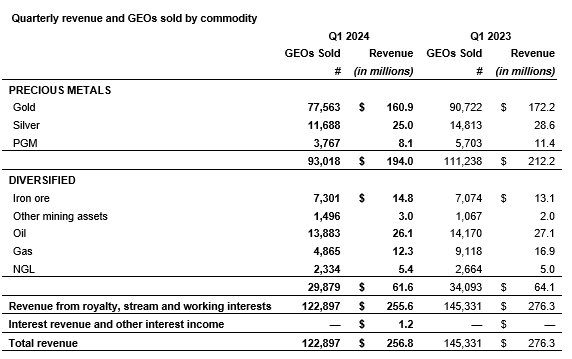 (5-per-cent royalty): GEOs from its Stillwater royalty decreased in Q1 2024 compared with Q1 2023 as the decline in PGM prices more than offset higher production at the mine. Sibanye-Stillwater is repositioning its U.S. PGM operations in light of the lower-palladium-price environment.