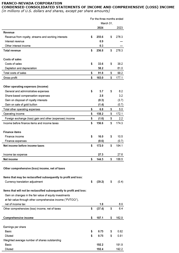 The complete condensed consolidated interim financial statements and management's discussion and analysis can be found on Franco-Nevada's website, on SEDAR+ and on EDGAR.