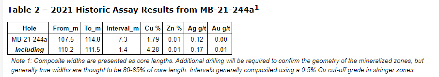 8.5 m grading 1.56 per cent Cu, 2.05 per cent Zn, 24.3 g/t Ag and 0.65 g/t Au (2.52 per cent CuEq), including 2.6 m grading 0.85 per cent Cu, 2.64 per cent Zn, 19.5 g/t Ag and 1.59 g/t Au (2.58 per cent CuEq).