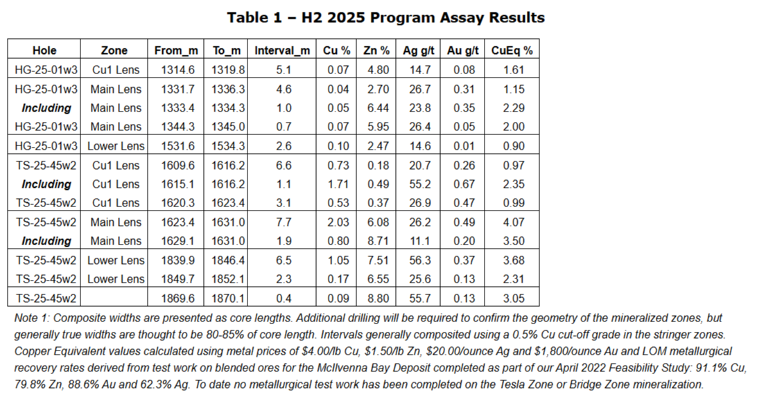 Advancing toward an inaugural resource estimate for the Tesla zone: Data compilations and modelling are currently under way for the Tesla zone, incorporating all results up to the end of the 2025 program. The inaugural resource estimate is expected to be completed during the second half of 2026, with the results supporting the company's phased expansion opportunities as it advances McIlvenna Bay toward commercial production by mid-2026.