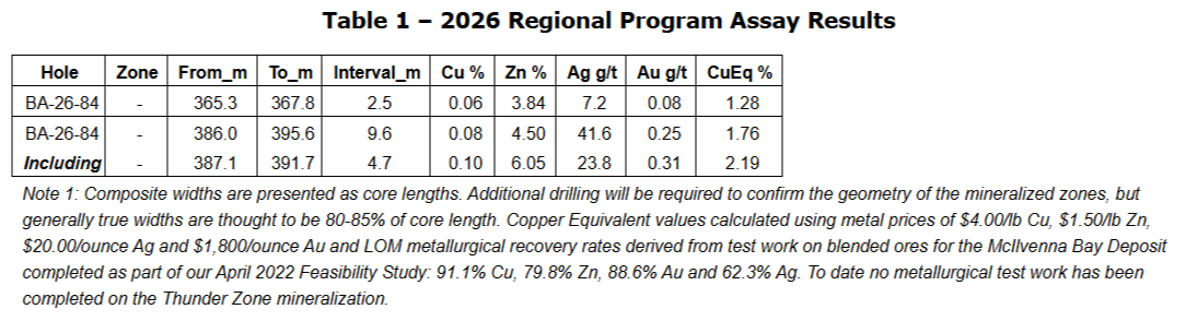 The 2026 winter regional exploration program is expected to consist of up to 3,000 m of drilling across several target areas, along with a small program of surface and borehole EM surveying in the Thunder zone area to better define the target for follow-up. The Thunder zone is located approximately five kilometres southeast of McIlvenna Bay, along a clearly defined magnetic trend that hosts both the McIlvenna Bay deposit and Tesla zone. Assay composites from the drilling are provided in Table 1 below.