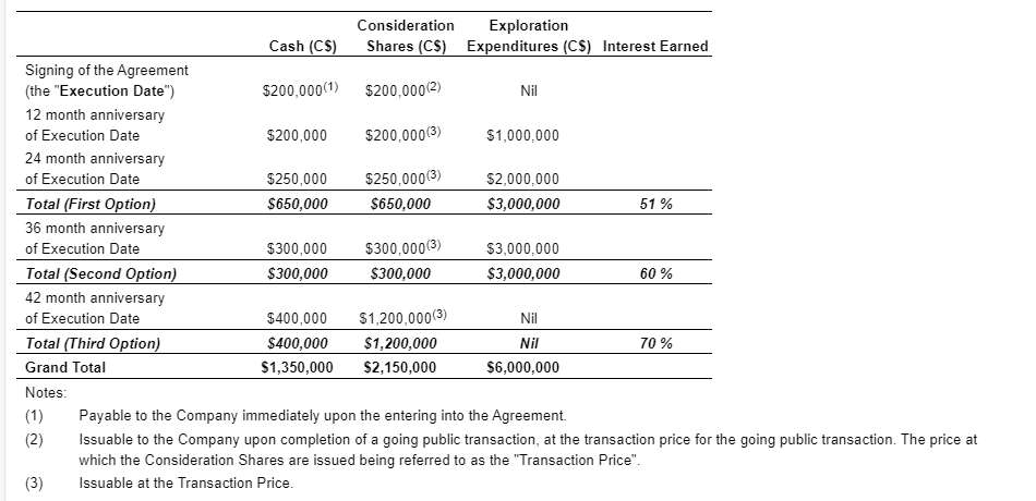 Pursuant to the terms of the agreement, the optionee shall have the right to earn up to a 70-per-cent interest in the projects in consideration for a series of cash payments, the issuance of common shares following completion of a going-public transaction and incurring certain exploration expenditures, as noted herein.