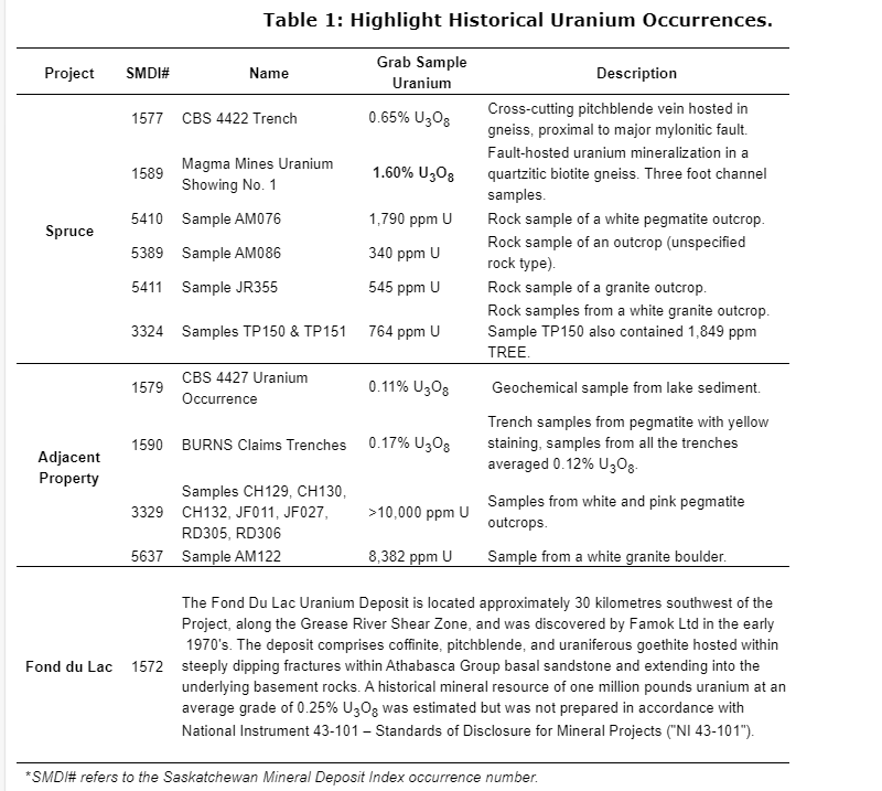 The historical results contained within this news release have not been verified and there is a risk that any future confirmation work and exploration may produce results that substantially differ from the historical results. The company considers these historical results relevant to assess the mineralization and economic potential of the property. The company also cautions that historical results on adjacent properties are not necessarily indicative of the results that may be achieved on the project. Further details regarding the historical occurrences noted in this news release can be found within the Saskatchewan Mineral Deposit Index (SMDI) using the reference numbers provided herein.