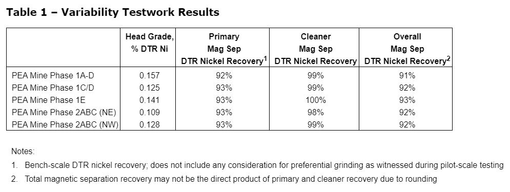 Metallurgical test work clearly demonstrated consistent magnetic separation nickel recoveries across all phases of the Baptiste mine plan