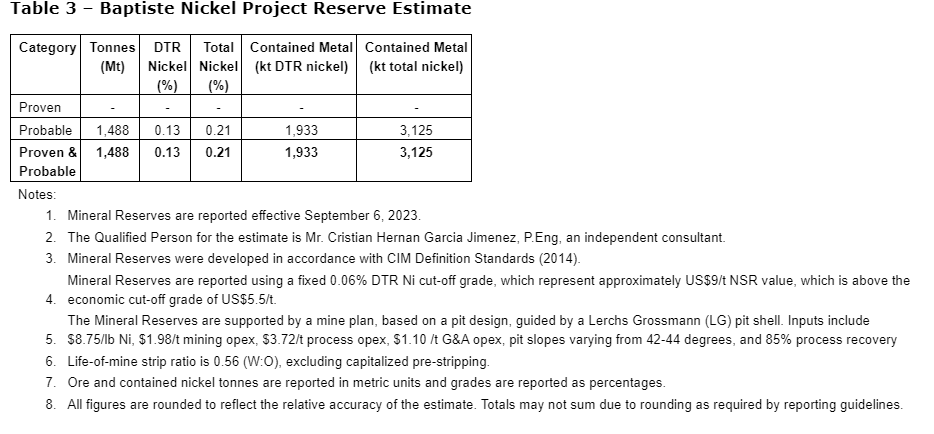 Based on published market data, the payability for nickel content in MHP ranged from 70 per cent to 90 per cent of the LME nickel price over the 2020 to 2022 period, with the low end of that payability range coinciding with the period of extreme market volatility and elevated LME nickel prices in the first half of 2022. For the purposes of the PFS economic analysis, payability of 87 per cent of the LME nickel price has been assumed for the Baptiste MHP product.