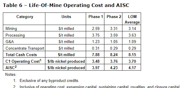 Total operating costs are estimated to average $8.15 per tonne milled for life of mine, for an equivalent C1 cost of $3.70/lb nickel produced (exclusive of any byproduct credits). Phase 1 operating costs of $7.88/t milled are lower than the life-of-mine average, primarily due to the impact of the lower strip ratio in the early operating years. Inclusive of royalties, sustaining capital, expansion capital and closure capital, AISC (all-in sustaining cost) is estimated to average $4.17/lb nickel produced for life of mine.
