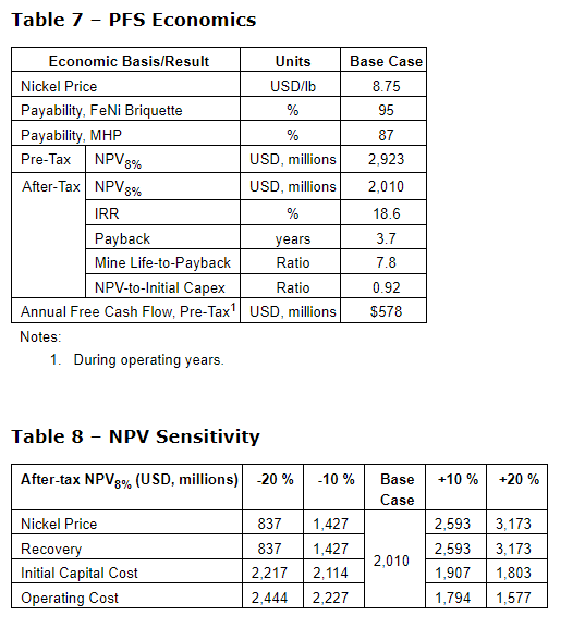 After-tax NPV (8 per cent) of $2.01-billion and IRR of 18.6 per cent at $8.75/lb Ni;
