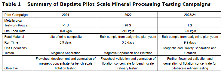 The test work reported herein represents the third pilot-scale mineral processing campaign the Company has completed for Baptiste. Key parameters from each pilot plant are summarized in Table 1, highlighting that the FS pilot plant was conducted at a significantly greater scale and run time than previously completed campaigns, permitting a longer duration of steady-state operation.