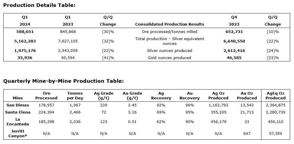 "Q1 represented a strong start to 2024 from a safety and production stance, with continued strong production from Santa Elena and an encouraging outlook for La Encantada," said Keith Neumeyer, President & CEO. "I am proud of the safety performance that we are achieving across our operations while delivering on our production plans. Santa Elena continues to exceed our expectations with another quarter of robust production. At La Encantada, our teams have been working diligently on sourcing additional water since June last year, and we are thrilled to have identified a new water source that is expected to put the operation back to budgeted throughput and production rates by Q3."