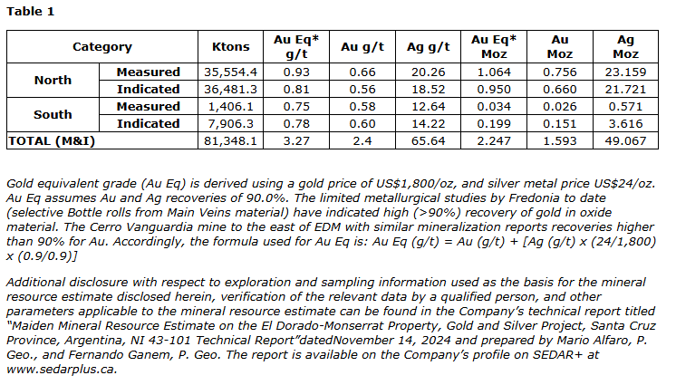 The program builds on the company's existing mineral resource estimate of approximately 2.25 million ounces of gold equivalent in the measured and indicated mineral resource categories (see Table 1 below).