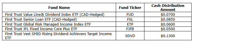 FT PORTFOLIOS CANADA CO. ANNOUNCES CASH DISTRIBUTIONS FOR ITS EXCHANGE TRADED FUNDS