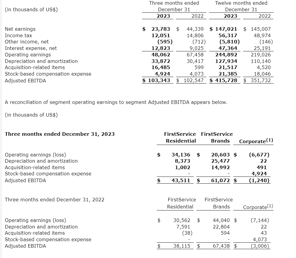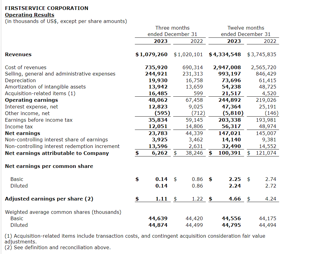FirstService Corp. has released fourth quarter and full-year results for the year ended Dec. 31, 2023. All amounts are in U.S. dollars.