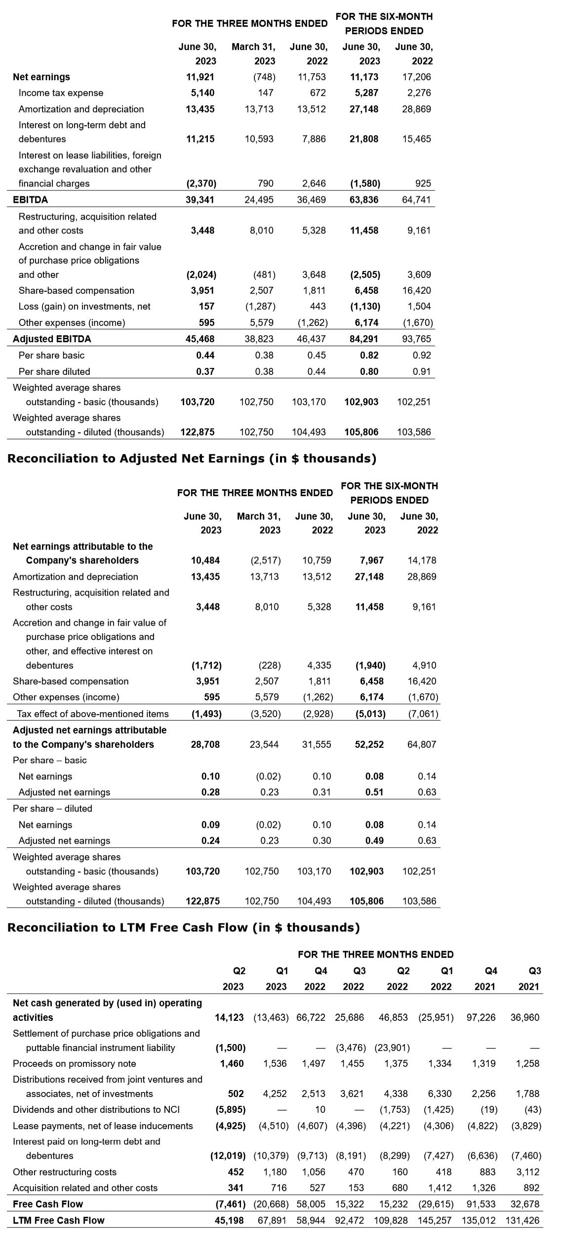 Adjusted net earnings decreased by $2.9-million, or 9.2 per cent, compared with Q2 2022, primarily due to lower revenues, higher interest on long-term debt and debentures, and higher-income tax expense, partly offset by lower SG&A, excluding share-based compensation.