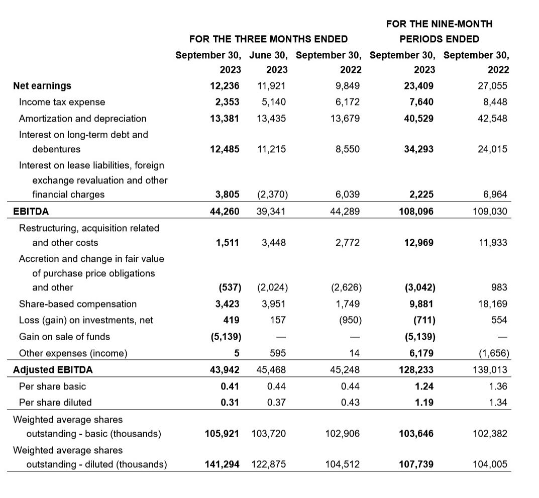 - Net earnings attributable to the company's shareholders increased by $2.4-million compared with Q3 2022 primarily due to the gain on sale of funds and lower income tax expense, which were partly offset by higher interest on long-term debt, higher accretion and fair value change on purchase price obligations, and lower revenues.