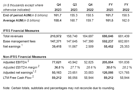 "The strength in financial markets in the fourth quarter combined with outperformance in several of our investment strategies resulted in a year-over-year increase in total revenues. Driven in part by strong performance fees during the quarter, we saw an improvement in our adjusted EBITDA margin to 30 per cent for the year. The significant increase in our adjusted EBITDA and adjusted net earnings also enabled us to further reduce our net debt in the fourth quarter and to generate a last twelve-month free cash flow which covered our dividend payments for 2023." said Lucas Pontillo, Executive Director and Global Chief Financial Officer. "With that, I am pleased to report that the Board of Directors has approved a dividend of 21.5 cents per share, payable