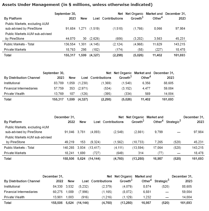 - A favourable market impact increased AUM by $17.6-billion on a year-to-date basis, which was partly offset by negative net organic growth of $13.3-billion. Negative net organic growth for the year included $13.6-billion in Public Markets partly offset by positive net organic growth in Private Markets, primarily from net new mandates. The sale of three Public Markets funds that were sub-advised by PineStone to New York Life Investments impacted AUM by $0.5-billion, and income distributions from Private Markets funds reduced AUM by $0.6-billion.