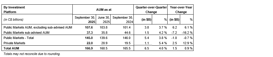 Total AUM increased 4.0 per cent in the quarter, reflecting positive net flows in both the public markets and private markets platforms, along with positive market growth and favourable foreign exchange impact from U.S. dollar appreciation.
