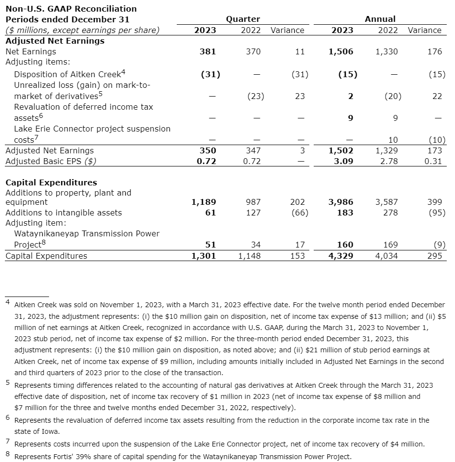 In accordance with United States GAAP (generally accepted accounting principles), reported net earnings attributable to common equity shareholders includes the results for Aitken Creek until the Nov. 1, 2023, date of disposition. Adjusted net earnings attributable to common equity shareholders reflects results for Aitken Creek through the March 31, 2023, effective date.