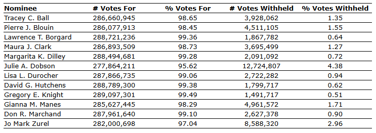 Fortis Inc. has released the voting results from its annual meeting of shareholders held today. Shareholders voted in favour of all items of business before the meeting, including electing the nominated directors, appointing Deloitte LLP as the corporation's auditor and approving the non-binding advisory vote regarding the corporation's approach to executive compensation.