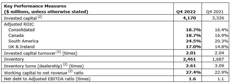 All comparisons are with Q4 2021 results unless indicated otherwise. All numbers, except ROIC, are in functional currency: Canada -- Canadian dollar; South America -- U.S. dollar; United Kingdom and Ireland -- U.K. pound sterling. These variances and ratios for South America and U.K. and Ireland exclude the foreign currency translation impact from the Canadian dollar relative to the U.S. dollar and pound sterling, respectively, and are therefore, considered to be specified financial measures. The company believes the variances and ratios in functional currency provide meaningful information about operational performance of the reporting segment.