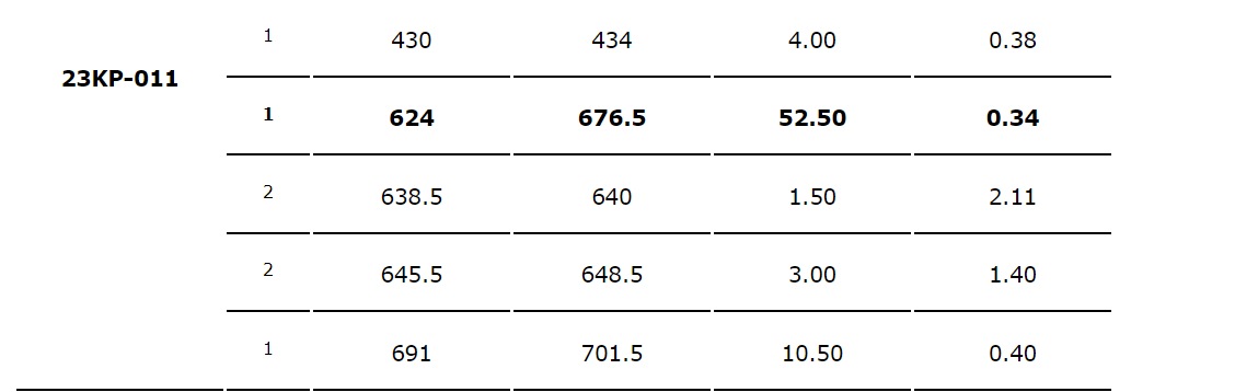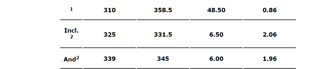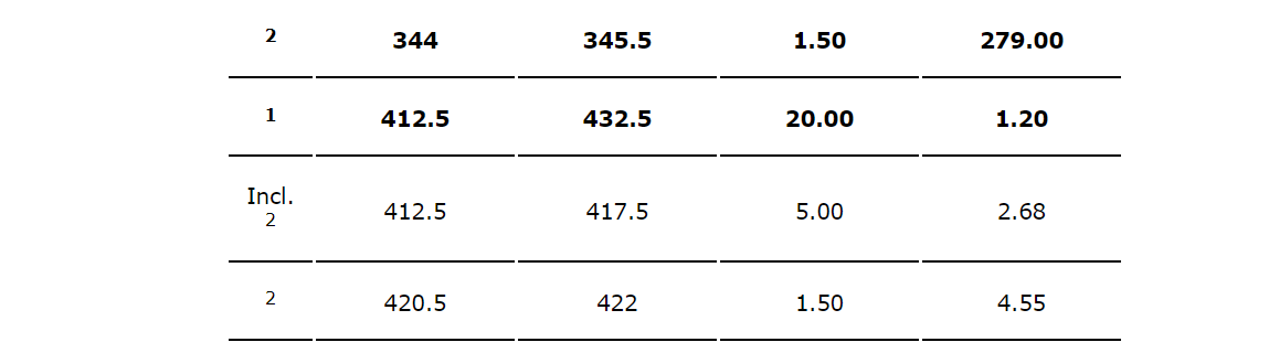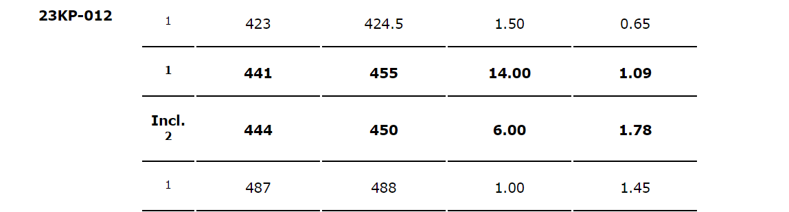 Three drill holes targeted the westerly continuation of the high-grade intercept reported from drill hole 22KP-008 (13.5 m of 8.05 g/t Au -- see news release dated Dec. 21, 2022). These drill holes intercepted 22.5 m of 0.52 g/t gold from 23KP-009, 19.5 m of 0.66 g/t gold from 23KP-010 and 52.5 m of 0.34 g/t gold from 23KP-011 (see an attached table). Results for a single hole testing the easterly continuation of the same 2022 intercept encountered additional broad zones of mineralization, including 48.5 m of 0.86 g/t gold, 16.5 m of 1.42 g/t gold, including 11.55 g/t gold over 1.5 m, and 14 m of 1.09 g/t gold from 23KP-012 (see an attached table). Notably, the intercepts reported from drill hole 23KP-012 occur approximately 125 m down plunge to the east of the reported 2022 drill intercept of 8.05 g/t gold over 13.5 m (see news release dated Dec. 21, 2022).