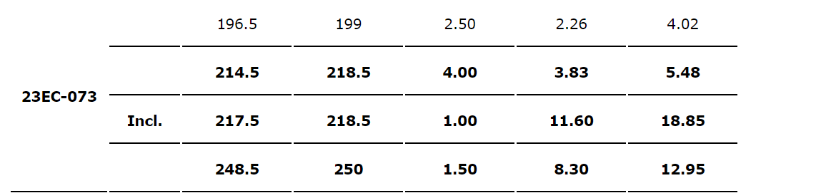 Fury Gold Mines Ltd. has released the fourth set of results from the 2023 drilling program at the Hinge target, part of the high-grade Eau Claire gold project located in the Eeyou Istchee territory in the James Bay region of Quebec. The Hinge target continues to produce multiple stacked zones of gold-mineralized quartz tourmaline veins. Highlights from the seven drill holes include: 31.77 grams per tonne gold over 3.5 metres from 23EC-077; 65.3 g/t gold over 0.5 m and 14.25 g/t gold over one m from 23EC-074; 2.56 g/t gold over 7.5 m from 23EC-068; and 3.41 g/t gold over 6.5 m and five g/t gold over 3.5 m from 23EC-075 (see an attached table). The 2023 Hinge drilling has increased confidence in the geological model and potential for expansion of the Eau Claire resource to the west. Results from an additional five drill holes are still pending for the Hinge target.