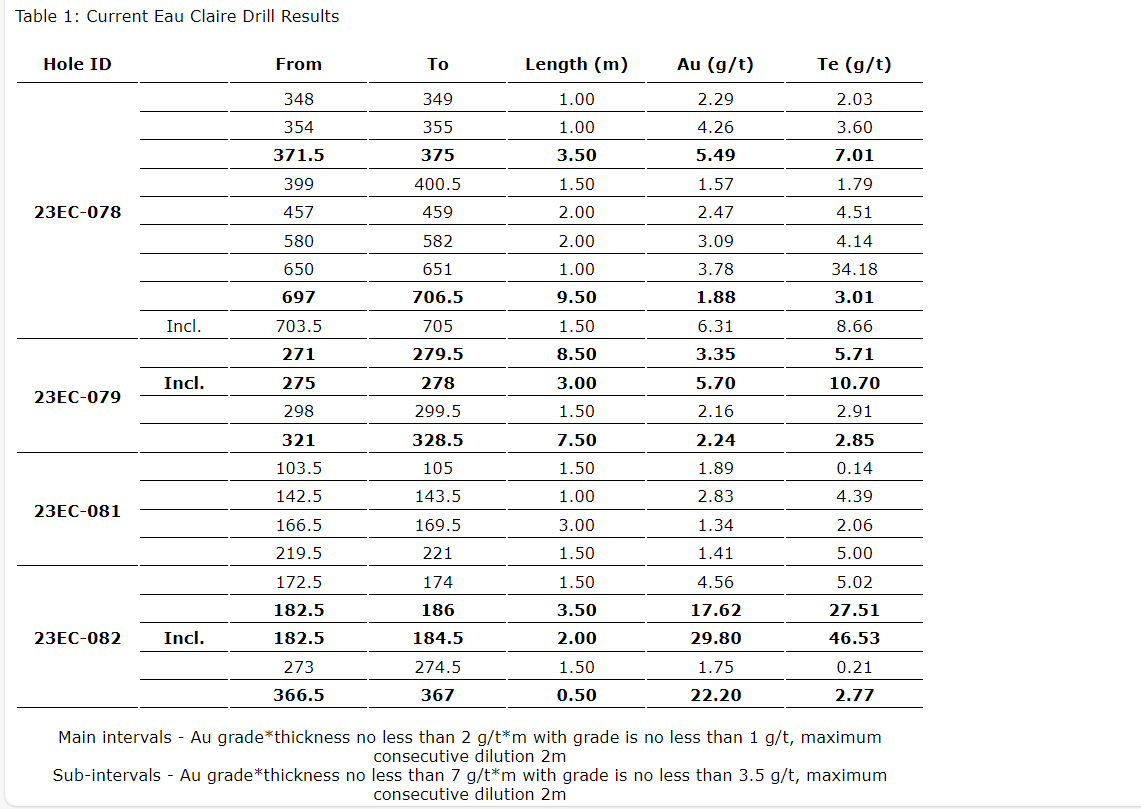 "This latest round of drill results have clearly demonstrated that the Hinge target connects with and will extend the defined Eau Claire gold resource. More importantly, we have intercepted high-grade gold over good widths near surface and the potential up-dip continuation of the mineralization is a compelling target for Fury to pursue. Now that all of the 2023 results for the Hinge are finalized, the technical team is working hard on updating the mineral resource estimate," stated Bryan Atkinson, senior vice-president of exploration at Fury.