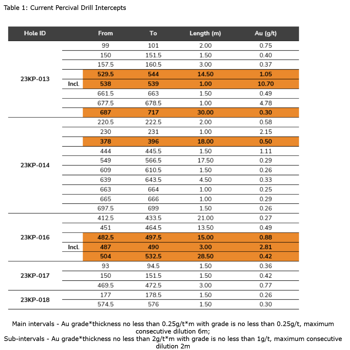 Drilling in 2023 was designed to target down plunge and along strike extensions of the known mineralization at Percival most notably from Fury's 2022 drill holes 22KP-008 (13.5 m of 8.05 g/t gold, including 3.00 m of 25.8 g/t Au) and 22KP-005 (7.5 m of 4.38 g/t Au) (see news release dated December 21, 2022). The 2023 drilling program was able to successfully extend mineralization to the east with drill hole 23KP-015 intercepting 279 g/t gold over 1.5 m in a 70 m step out from previous drilling (see news release dated November 6, 2023) as well as to the west with the reported intercept of 15.0 m of 0.88 g/t gold from drill hole 23KP-016.