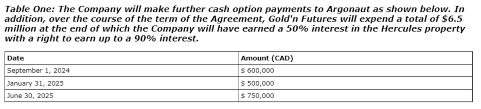 Gold'n Futures Mineral Corp. has made changes to its option agreement for the Hercules gold property. The agreement was previously announced in a news release dated Oct. 26, 2020, with an amendment announced on Sept. 28, 2022. In co-operation with the property optionor, Prodigy Gold Inc., the agreement is further amended so that all of the company's option payments to the optionor and work obligations are paused for a period of one year. The new schedule of the payment obligations is contained in an associated table. The amendment was initiated under existing terms of the agreement and allows Gold'n Futures time to catch up with and to complete exploration programs, together with upgrading previous quality control and quality assurance (QA/QC) measures to meet current regulatory standards such as may be contained in National Instrument 43-101 policies.