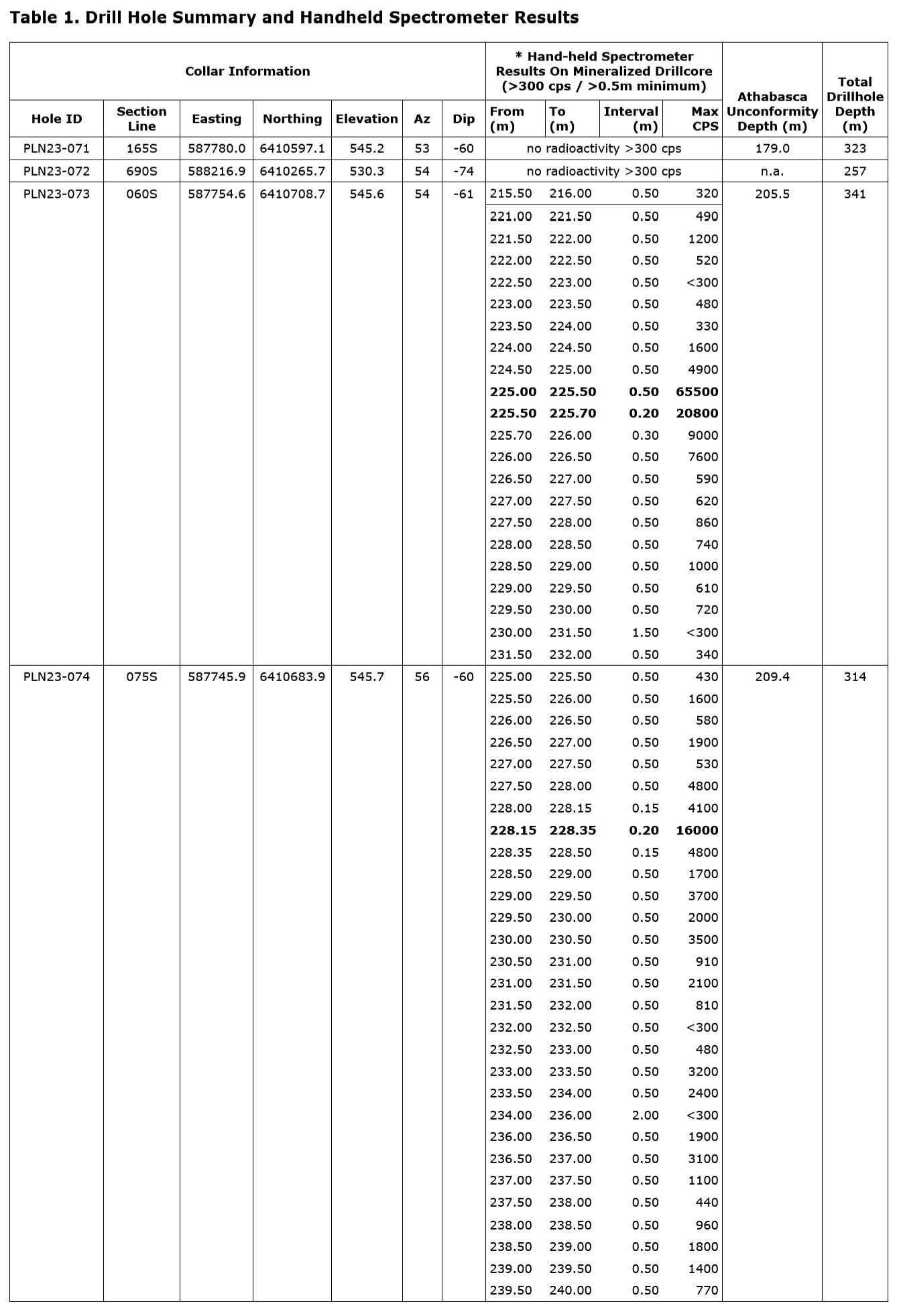 "We are excited that basement mineralization has been intersected even closer to the Athabasca unconformity, now within eight m, as this reinforces the potential for an unconformity or sandstone component to the JR zone mineralization. The discovery of mineralization at the unconformity or in the sandstone would provide a compelling new target for JR zone expansion drilling. Tests updip from the JR zone mineralization are ongoing to define the best possible target at the unconformity for this drill program. The Shea Creek deposit 46 kilometres to the north of PLN and the Key Lake deposit on the east side of the basin are examples where basement hosted uranium mineralization extends through the unconformity and into the sandstone. The first step-out hole on line 165S did not intersect mineralization but additional drill holes are being planned on that section to continue to expand the footprint along strike of the JR zone basement mineralization. In addition, exploration drilling along the A1 main shear zone has commenced and prospective targets will be tested."