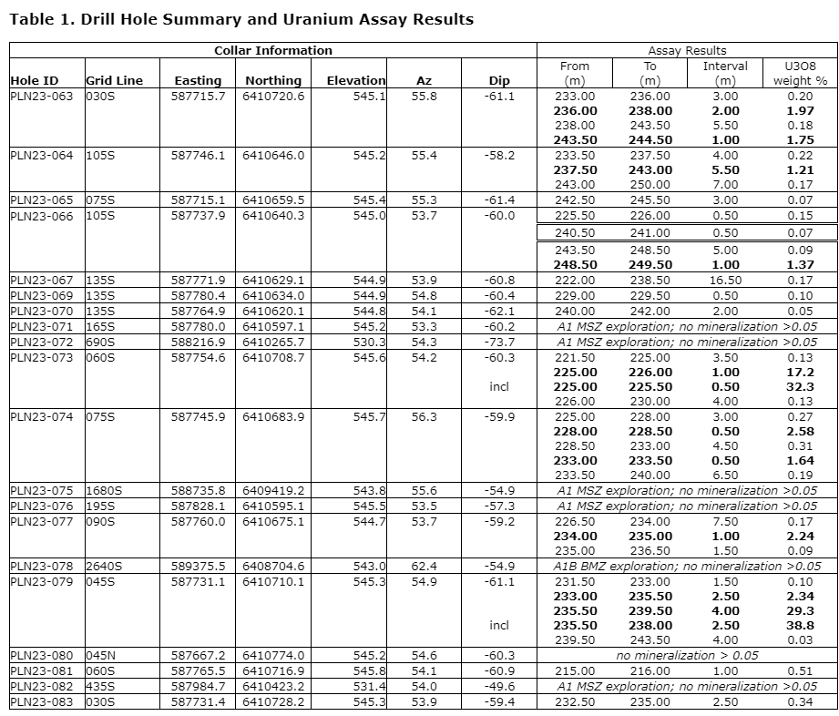F3 Uranium Corp. has released initial assay results for the continuing drill program, including PLN23-079 (see news release dated Aug. 14, 2023), which returned 12 metres of 10.3 per cent U3O8 (triuranium octoxide), including a high grade 6.5 m interval averaging 18.9 per cent U3O8, further including an ultrahigh grade core of 2.5 m of 38.8 per cent U3O8.