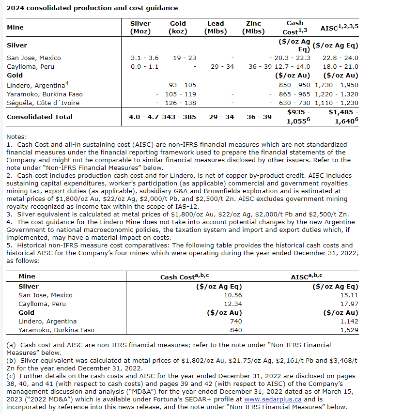 - The company expects a 2024 cash cost between $12.7 and $14 per ounce of silver, a decrease of approximately 6 per cent under 2023 at the upper range, and 14 per cent at the lower range of guidance. The decrease is mainly due to lower treatment and refining charges in 2024.