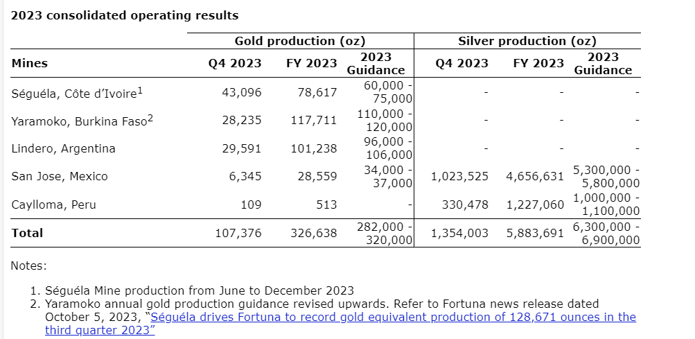has released production results for the fourth quarter and full-year 2023 from its five operating mines in Latin America and West Africa. For the full-year 2023, Fortuna produced a record 326,638 ounces of gold and 5,883,691 ounces of silver or a record 452,389 gold equivalent ounces, including lead and zinc byproducts. All references to dollar amounts in this news release are expressed in U.S. dollars.