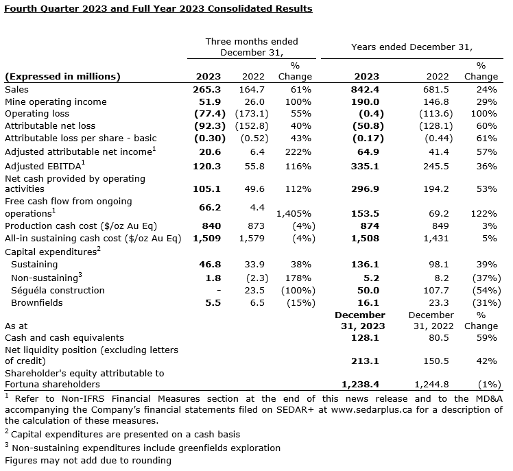 FORTUNA REPORTS RESULTS FOR THE FOURTH QUARTER AND FULL YEAR 2023