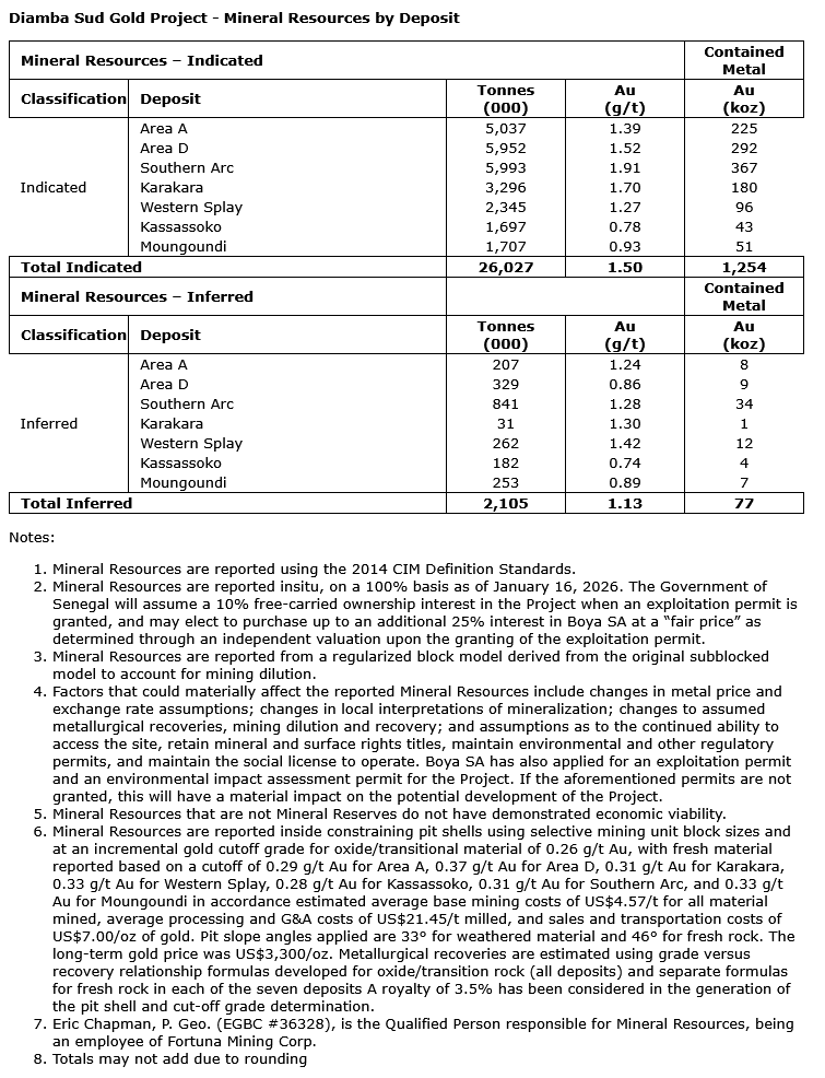 Jorge A. Ganoza, president and chief executive officer, commented: "This updated mineral resource estimate represents a significant advancement for the Diamba Sud gold project, highlighted by a 73-per-cent increase in indicated gold ounces with 94 per cent of total gold ounces now in the indicated category. This update provides a strong foundation for the feasibility study we plan to publish by midyear 2026 and materially advances the project toward a final investment decision." Mr. Ganoza continued, "Diamba Sud, together with the expansion of the Seguela mine, currently under study, is central to our strategy to grow Fortuna into a company capable of producing more than 500,000 ounces of gold annually from long-life assets."