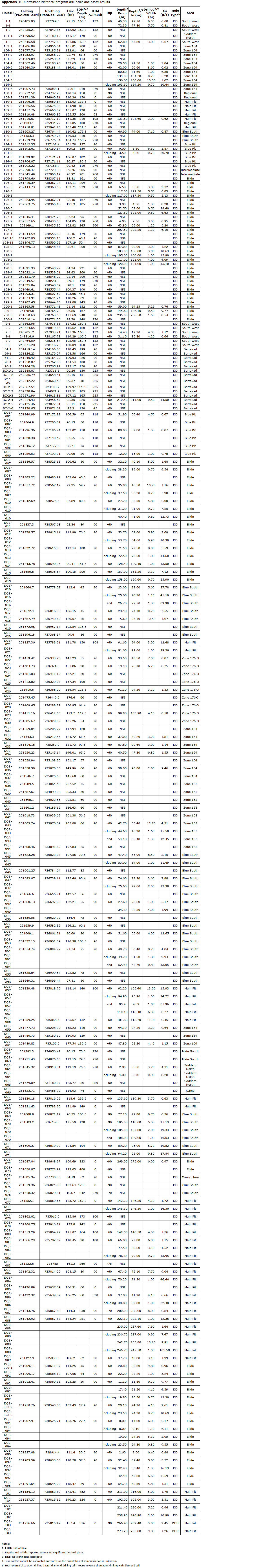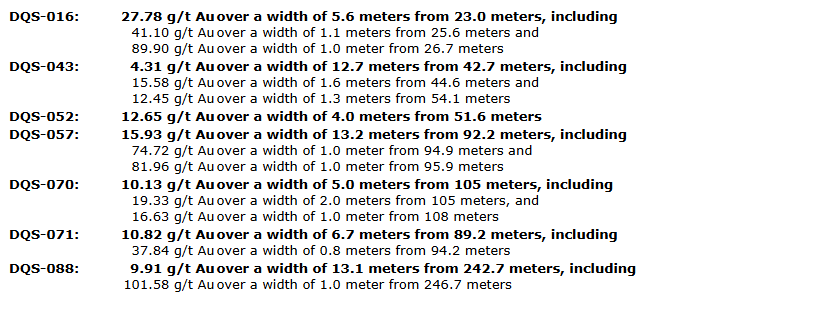 A total of 183 diamond core drill holes, comprising 23,190 metres, were completed between 2010 and 2017. Drilling along a five-kilometre corridor identified multiple zones of high-grade near-surface gold mineralization. Drill highlights included in the attached table.