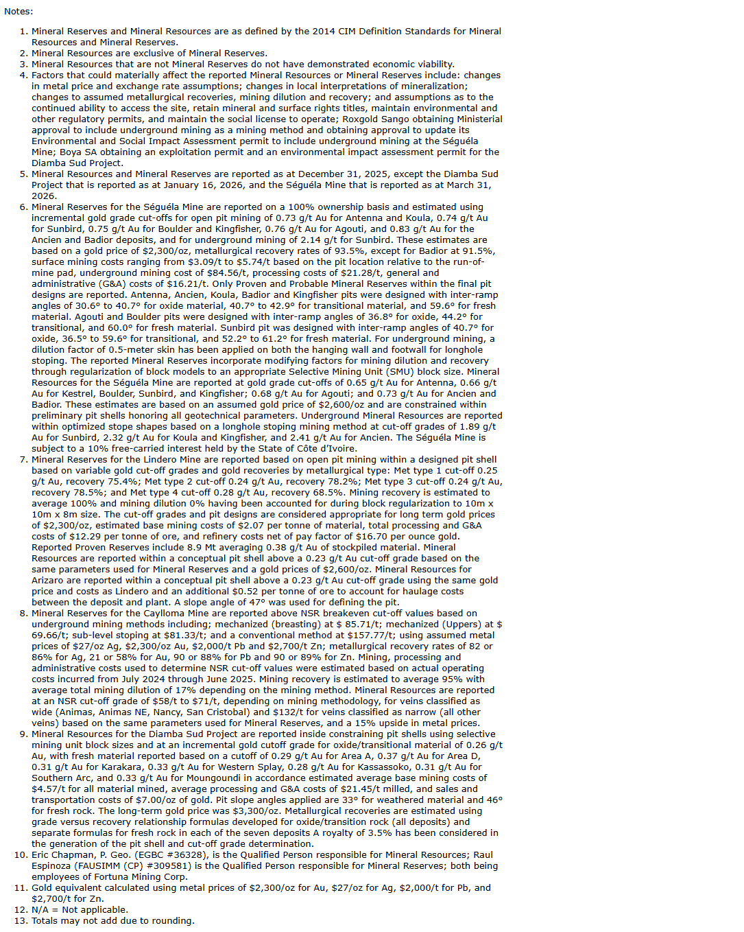 Fortuna Mining Corp. has provided updated consolidated mineral reserve and mineral resource estimates for its operating mines and projects in West Africa and Latin America. Fortuna successfully increased mineral reserves by 15 per cent year over year, after accounting for production related depletion. In addition, an updated estimate for Seguela as of March 31, 2026, reported an increase of 34 per cent in underground mineral reserves and a 55-per-cent increase in inferred mineral resources for the Sunbird deposit as a result of the successful infill and exploration drilling program executed in the second half of 2025. All dollar amounts in this news release are expressed in United States dollars, unless otherwise indicated.