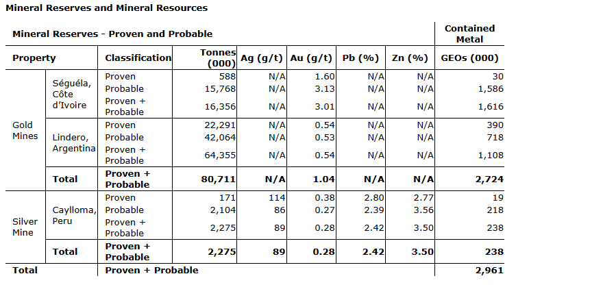 Consolidated proven and probable mineral reserves are reported containing 3.0 million gold equivalent ounces (GEOs) representing a year-over-year increase of 15 per cent. Changes are due to the upgrading of resources to reserves representing 819,000 GEOs, primarily at Seguela, offset by production related depletion of 378,000 GEOs.