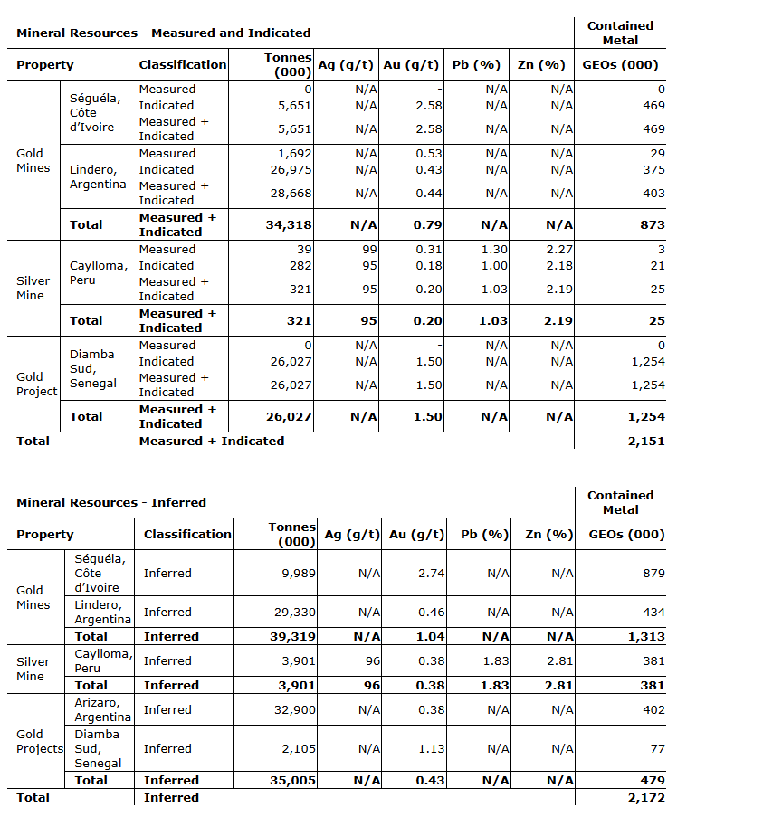 - Consolidated measured and indicated resources exclusive of mineral reserves are reported containing 2.1 million GEOs representing a year-over-year increase of 56 per cent. Primary drivers for the net increase are the result of drilling at Diamba Sud, upgrading 781,000 GEOs, a 165-per-cent increase, offset by the upgrading of resources to reserves at Seguela.