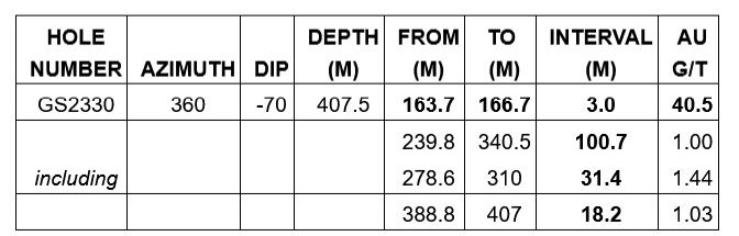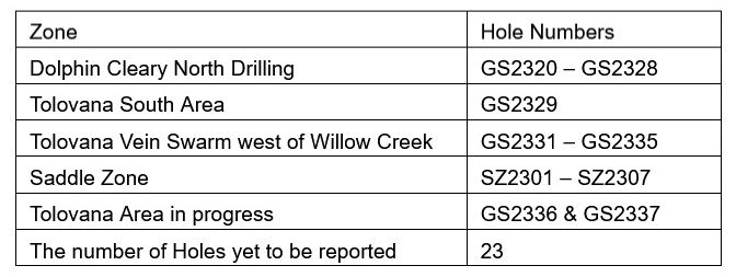 Assays are still pending for the holes drilled north of the Dolphin Cleary zones (GS2320 to GS2328). The primary purpose of these holes was to define the mineralization extent in the north and immediate northwest and they have successfully intersected the updip of the overall mineralized trend.