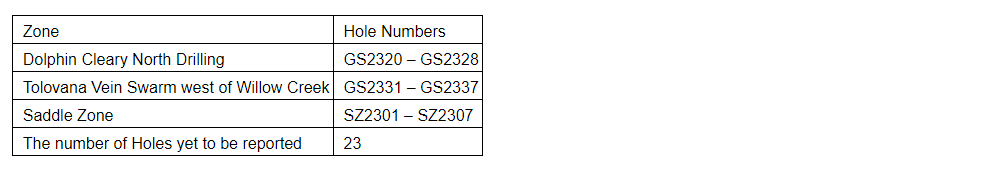 Assays are pending for holes GS2331 to GS2337, drilled west and to the west of Willow Creek, intended to expand the higher-grade mineralization toward the west. Hole GS2337 was drilled in a previously untested geochemical trend to the southwest of the Dolphin zone. Visible gold has been noted in GS2237.