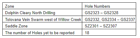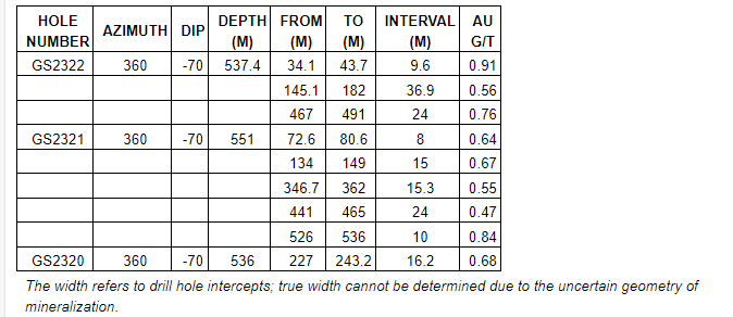 Holes GS2322, GS2321 and GS2320 were aimed at confirming the mineralization boundaries to the north of the existing resource in the Dolphin zone. These holes intersected faulting/shearing and the bounding marble units to the north identified earlier in the season.