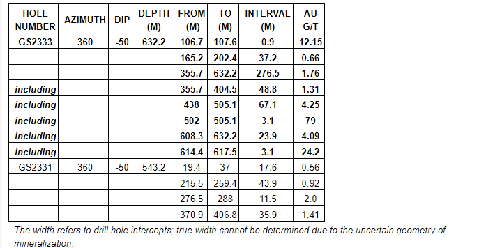 Hole GS2331 targeted the area to the north of the known historic veins, intersecting several zones of higher-grade mineralization, including two g/t over 11.5 metres from 276.6 metres to 288 metres and 1.41 g/t Au over 35.9 metres from 370.9 to 406.8 metres. Further drilling will be required to follow up on the higher-grade mineralization intersected in GS2331 and GS2333.