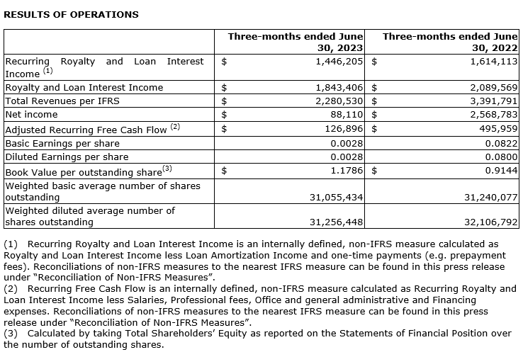 Recurring royalty and loan interest income of $1.45-million in Q2, down 4.2 per cent quarter over quarter;