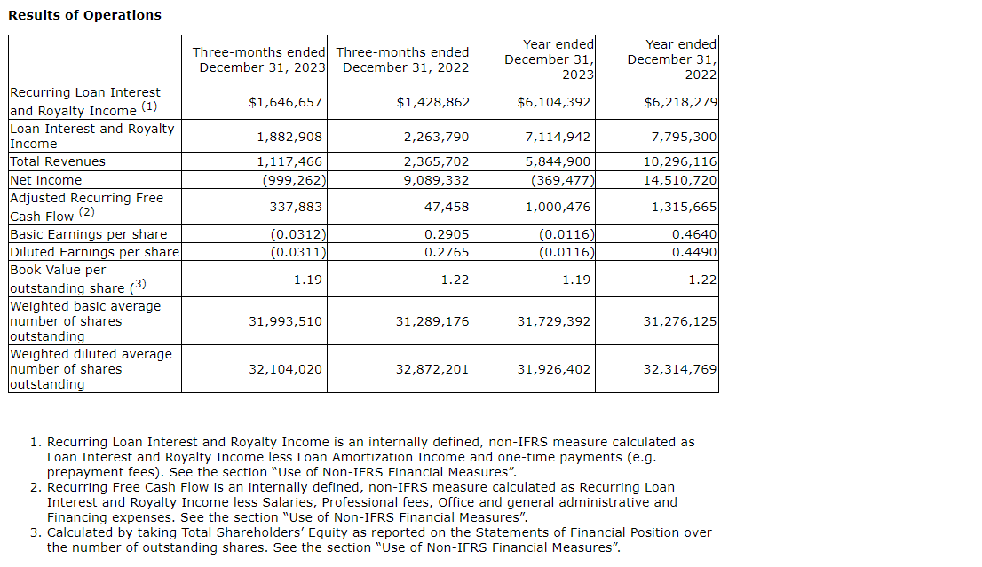 Recurring loan interest and royalty income is an internally defined, non-IFRS (international financial reporting standards) measure calculated as loan interest and royalty income less loan amortization income and one-time payments (for example, prepayment fees).