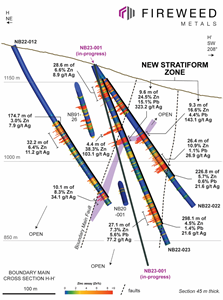 The 2023 program will utilize five diamond drill-rigs, targeting over 16,000 m of drilling between Boundary, Tom, and Jason zones. The initial phase of drilling (Phase 1) with the first drill is currently underway. This phase is focused on stepping out from the high-grade intersections drilled at Boundary Zone in 2022 such as holes NB22-023 that intersected 298 m of 4.5% zinc, 1.4% lead, and 30.9 g/t silver including a new stratiform zone of 9.6 m grading 24.5% zinc, 15.1% lead, and 323.2 g/t silver (see Fireweed news release dated March 2, 2023).