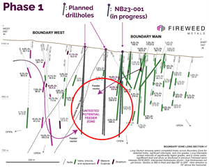 The Phase 1 2023 step-outs will include testing the potential continuation of the high-grade stratiform mineralization and massive sulphide mineralization at Boundary West and Boundary Main. Fireweed has identified an area between Boundary West and Boundary Main that has geological potential to host a high-grade feeder zone and is flanked by two of Fireweed’s best ever drillholes at Boundary Zone, NB22-002 and NB22-023 (see Fireweed news releases dated November 22, 2022, and March 2, 2023). The Phase 1 program will provide a first pass drill test of this potential feeder area that may link Boundary Main and Boundary West (Long Section I-I', Cross Section H-H’, and Map 2).
