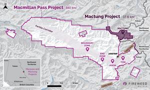 - Macmillan Pass Project (Zinc-Lead-Silver): Fireweed owns 100% of the district-scale 940 km2 Macmillan Pass project in Yukon, Canada, which is host to one of the largest undeveloped zinc resources in the world* where the Tom and Jason zinc-lead-silver deposits have current Mineral Resources1 (11.21 Mt Indicated Resource at 6.59% zinc, 2.48% lead, and 21.33 g/t silver; and 39.47 Mt Inferred Resource at 5.84% zinc, 3.14% lead, and 38.15 g/t silver) and a Preliminary Economic Assessment2 (PEA). In addition, Boundary Main, Boundary West, Tom North and End Zone have significant zinc-lead-silver mineralization drilled but not yet classified as mineral resources. The project also includes large blocks of adjacent claims with known showings and significant upside exploration potential.