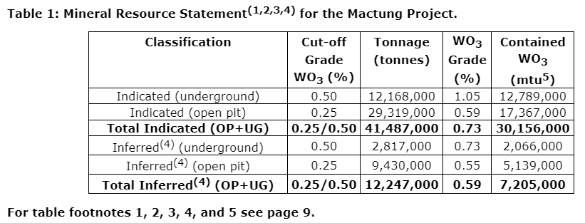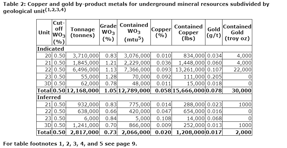 Mineral resources are classified under the categories of measured, indicated and inferred according to CIM definition standards for mineral resources and mineral reserves (adopted by CIM council May 19, 2014). Mineral resource classification for WO3 was based primarily on an analysis of viability and risk, drill hole spacing, and on continuity of mineralization. Inferred and indicated resources were defined as using increasing thresholds of continuity, confidence and data density. No measured resources were defined. Final resource classification shells were manually constructed using interpreted solids. Gold and copper are not classified separately and are reported as byproducts based on WO3 classification. A full description of the modelling methodologies for each deposit will be included in a technical report scheduled for release within 45 days.