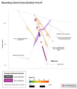 NB23-001 was drilled as a step-out from NB22-023 following up high-grade zinc intercepts in stratiform, breccia, and vein hosted mineralization (e.g. NB22-023 hit 9.6 m at 24.5% zinc, 15.1% lead, and 323.2 g/t silver, see Fireweed news release dated March 2, 2023). Hole NB23-001 successfully intersected sphalerite-galena mineralization over comparable widths, approximately 30 m down-dip, and in the same stratigraphic layer as the new stratiform zone intersected in NB22-023 and NB22-022, providing a step-out and increasing confidence in the continuity of the new stratiform zone at Boundary Main. The hole was extended 70 m past target depth due to additional intersections of sphalerite veins and pyrite-sphalerite massive sulphide mineralization downhole, and the hole was terminated at 460 m. See cross-section H–H’ for more details.